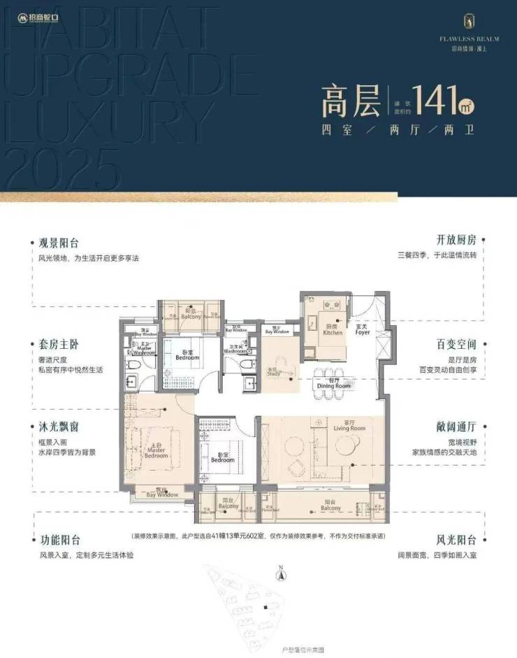 建筑面积约105㎡三房,进阶改善绝版“三阳台”户型,主力总价段约700万级,部分房源总价约650万级。