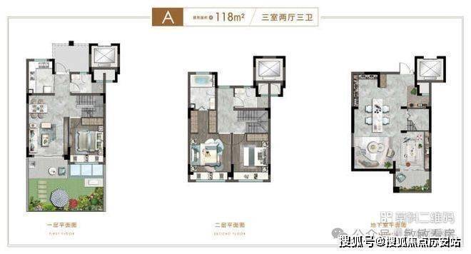 A户型建面约118㎡,三房二厅三卫