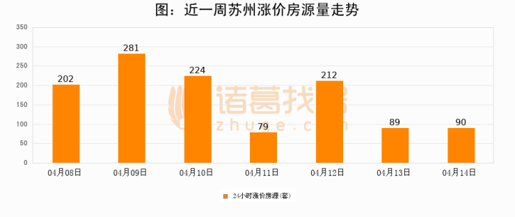 根据诸葛找房数据显示,苏州24小时涨价房源量为90套,较04月13日增加1套,环比上涨1.1%。与此同时,涨价房源占比小幅扩大,业主信心有所提升。
