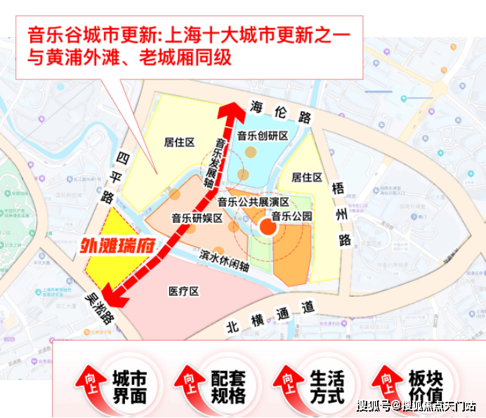 项目紧挨嘉兴01单元,正对上海音乐谷,未来将形成滨水艺术休闲区,规划新增8个小剧场、3个livehouse、1个水上剧场,把“夜上海”的流量重新拉回虹口.从外滩瑞府出发,穿过一座步行桥,就能抵达这个未来的世界级演艺群落.