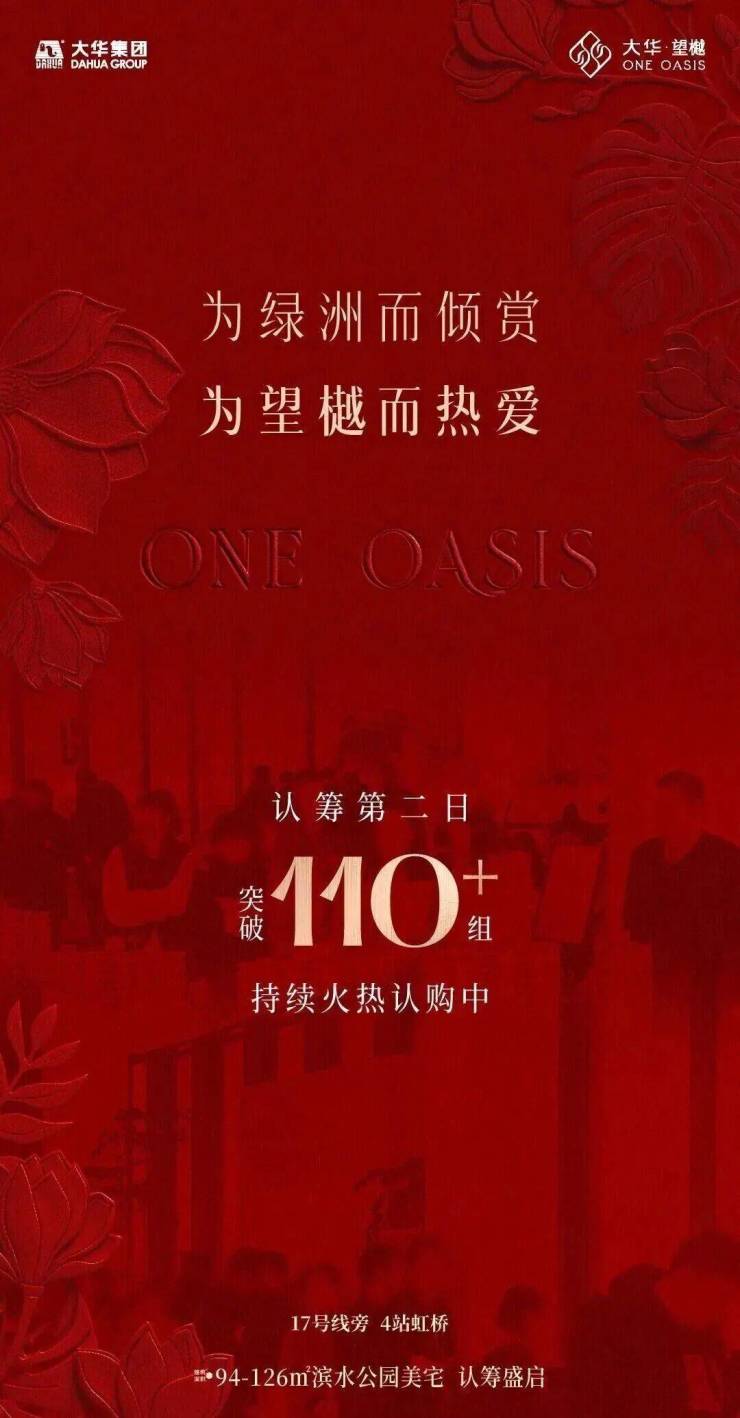 最新消息,大虹桥核芯低密住区「大华·望樾」,首批次房源今日热势开盘!据悉!短短数日,项目认购客户数量便突破110组,认筹比例迅速超过100%!凭借大华品牌的强大号召力、项目优势区位以及硬核产品力,掀起一股上海楼市的“望樾热潮”