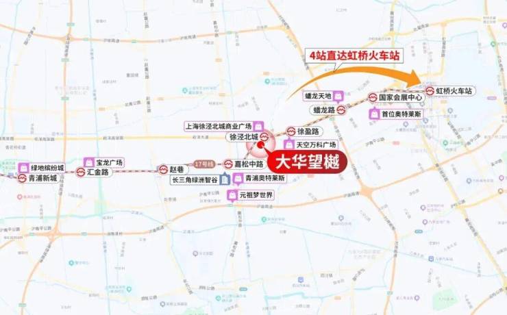 项目地块北侧紧邻17号线徐泾北城站,1站可达徐盈路天空万科广场,2站至蟠龙古镇商业区,3站直达国家会展中心,4站即达虹桥枢纽。