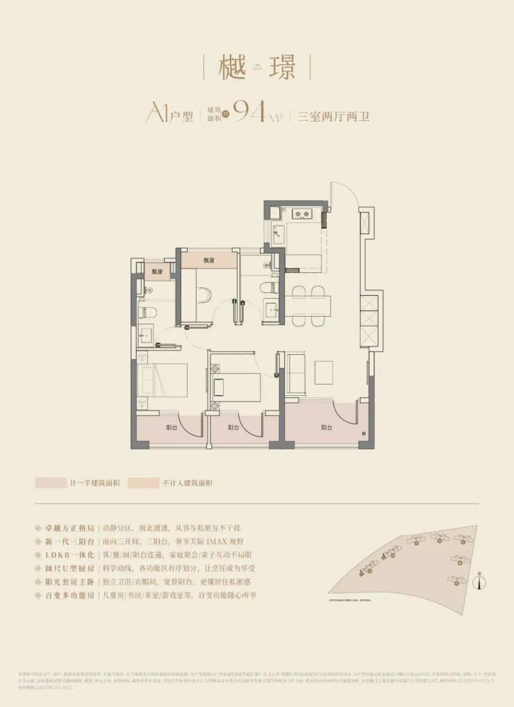 大华望樾的高层建面约94㎡户型做到了三阳台的配置;