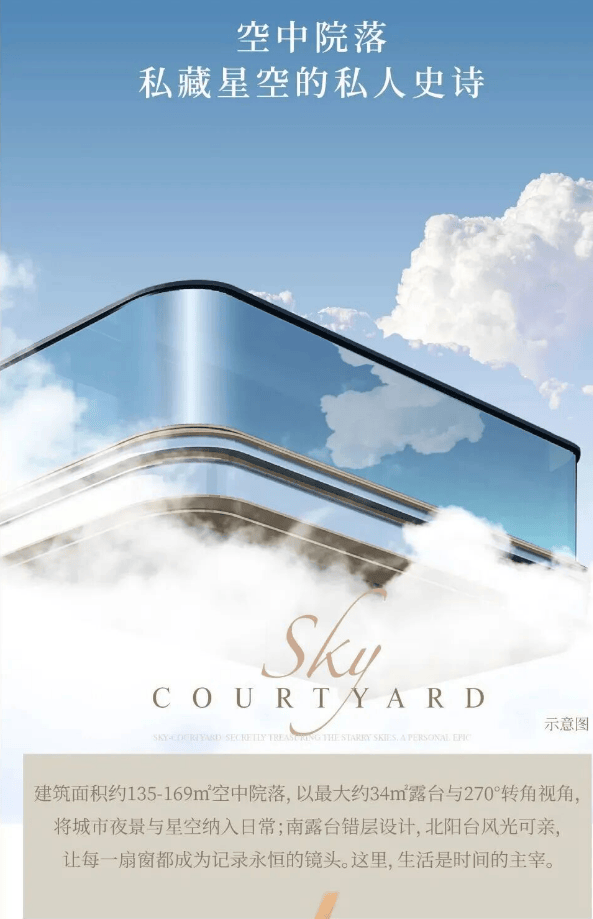 建筑面积约135-169㎡空中院落,南露台+北阳台,将城市风光全盘纳入,实现最大约34㎡露台与270°转角视角。