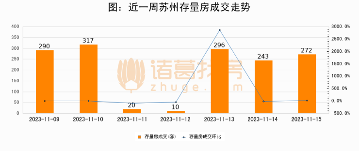 从存量房来看,2023年11月15日苏州存量房单日成交272套,比昨日增加29套,环比上涨11.9%。从近一周存量房成交来看,苏州存量房日均成交套数为206套,11月15日单日成交272套,高于近一周平均水平32%。