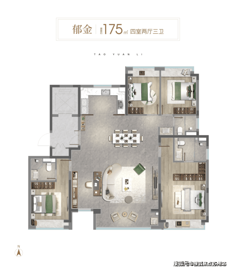 建筑面积约165㎡户型样板间,打造南向4.5开间,即在4开间的基础上,通过设计手法将餐厅、客厅、厨房、阳台融为一体,让传统竖厅的通透格局同时具备横厅的宽广空间。