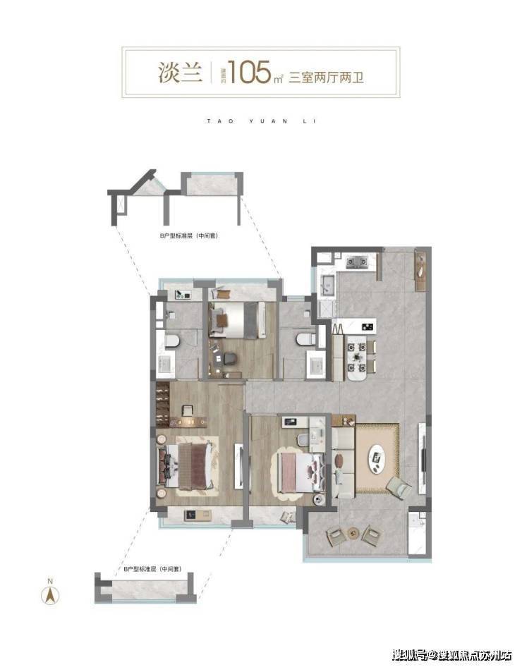 户型设计方面,105㎡样板间打造标准的三开间朝南设计,加之约3.1米的层高配置,整体居住体验明亮开阔。