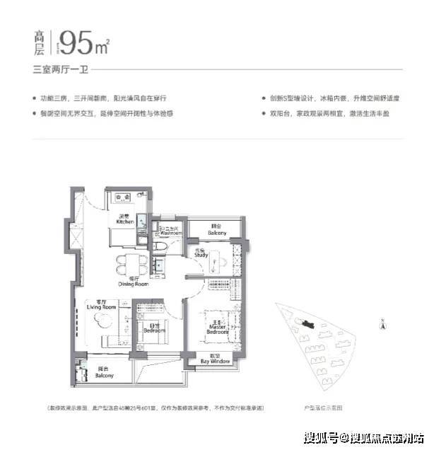 再加上南向大面宽短进深、全卧飘窗、L型转角阳台设计,哪怕小户型95㎡3房,尺度感都超棒,采光和视野更是一流。