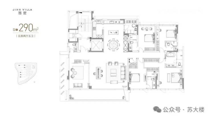 290㎡户型,拥有21米巨幕面宽,全屋5房5卫,4个套房+保姆房+半开放式书房;阳台面宽超11米,类露台使用体验;全屋得房率更是达到约90%!