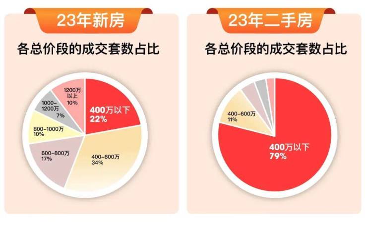 仅是2023年,总价400万以内的新房就已成交近1.2万套 ,占比约22% 。而在二手房市场,这一数据要高上7.6倍, 总价400万以内二手房成交9.16万套 ,占比约79% 。 当下,新房的性价比明显要略高于二手房,为何还会相差如此悬殊?