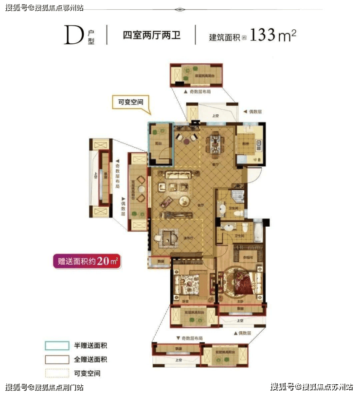 云锦城的户型一直以来备受好评。尤其是大户型,甚至被购房者称为“王炸”户型。如133㎡的户型,云锦城做到了四房两厅两卫,阳台是云锦城特有的“双层挑高”,增大采光的同时,还让改善生活有了更多从容的空间。 另外,133㎡的户型还有约20㎡的可变空间,这在如今得房率普遍下降的市场里,云锦城便显得格外珍贵了。