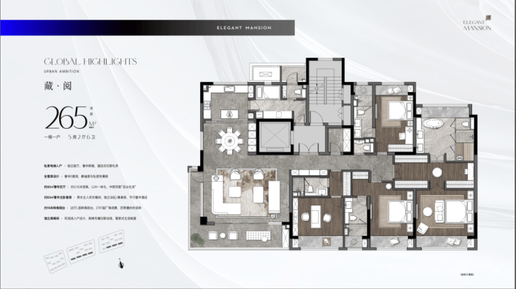 约265㎡:一梯一户,270°转角环幕厅,五套房设计,一线品牌精装,更独享桑拿房,将太湖风光与奢华生活融为一体。
