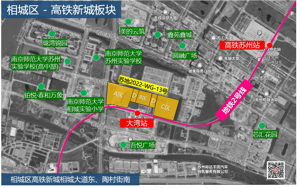 该地块分为A\B\C\D四个地块,位置也是比较优越的,位于2号线大湾站,住宅部分可以说是地铁上盖,地铁上盖,靠近南京师范大学相城实验小学、南京师范大学苏州实验学校,距离吾悦广场也是一步之遥。商业、教育可以说是环伺,后期生活会非常便捷。