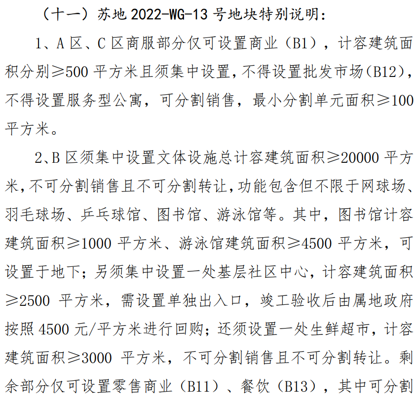对于这个地块的要求也是非常多的,其中B区要设置文体中心,功能包含但不限于网球场、 羽毛球场、乒乓球馆、图书馆、游泳馆等。另须集中设置一处基层社区中心,一处生鲜超市,剩余部分仅可设置零售商业(B11)、餐饮。此外,D区将打造为地下空间。