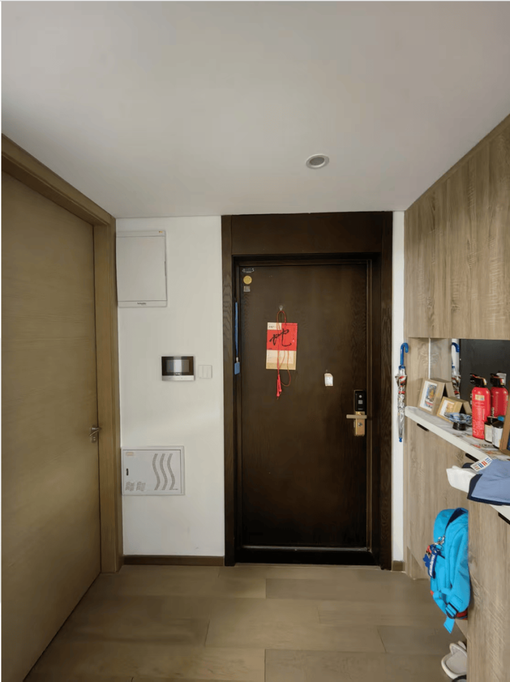 你可以看到门、入户收纳柜、次卧门、地板,这四种材质和颜色都是完全独立没有关系的