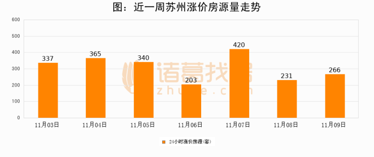 根据诸葛找房数据显示,苏州24小时涨价房源量为266套,较11月08日增加35套,环比上涨15.2%。与此同时,涨价房源占比小幅扩大,业主信心有所提升。