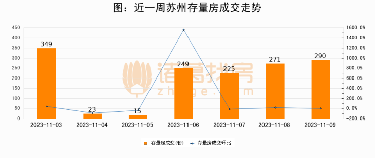 从存量房来看,2023年11月09日苏州存量房单日成交290套,比昨日增加19套,环比上涨7%。从近一周存量房成交来看,苏州存量房日均成交套数为203套,11月09日单日成交290套,高于近一周平均水平42.9%。