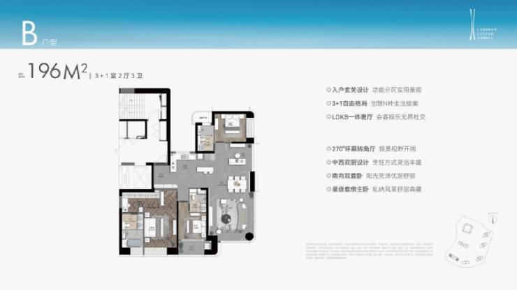 LARIMAR 逐浪·B户型:空间流动感强,采光面优异。