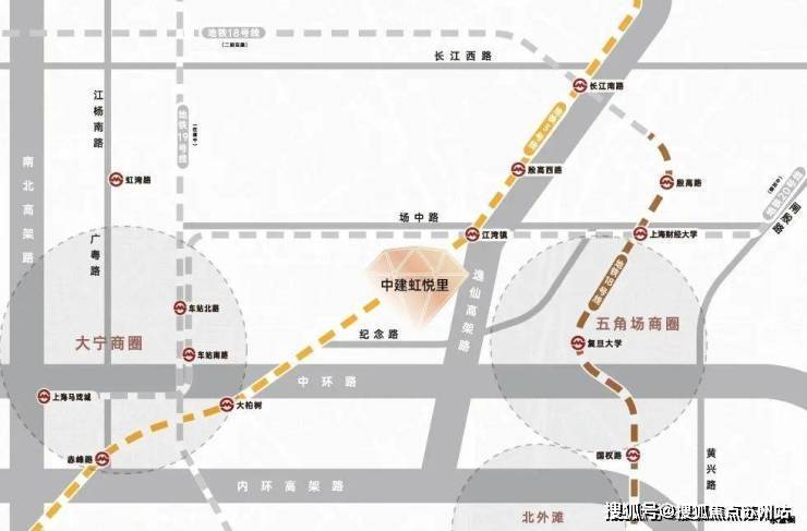 轨交配套:中建·虹悦里直线距离3号线大柏树站 约750米,直线距离江湾镇站均 约900米,步行可及。3号线也是多年才出一个轨交房。畅联中山公园/延安西路;三重高架:临近中环高架/逸仙高架及大柏树立交,迅捷衔接五角场/大宁等地;干道交通:周边汇聚逸仙路/汶水路/中山北路等城市主干道,便捷抵达全城。
