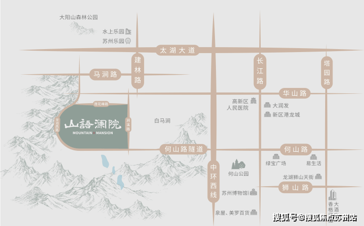 项目所处板块在地理位置上处于高新区中心位置,东有狮山核心CBD西有科技城,共享两个区域优质配套。以周边山水自然风光为基础,何山隧道为纽带,连通进一步项目与狮山片区。实现自然风光—项目—都市生活链条,构建多元生活场景。
