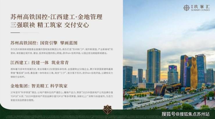 金地·玖峯汇由苏州高铁国控、江西建工、金地管理三强联袂共同打造,精工筑家,实现产品力的全面跃升与颠覆性创新。苏州高铁国控作为本土国企,深耕高铁新城多年,是板块建设的“主力军“;江西建工是拥有70余年光辉历史的国有建筑集团,曾打造过众多地标性建筑,斩获26项国家建筑“鲁班奖”,以硬核实力铸就行业标杆;金地集团则是房地产行业的“理科生”,深耕北上广深等70余座城市,在高端住宅开发领域经验丰富,堪称业内标杆。