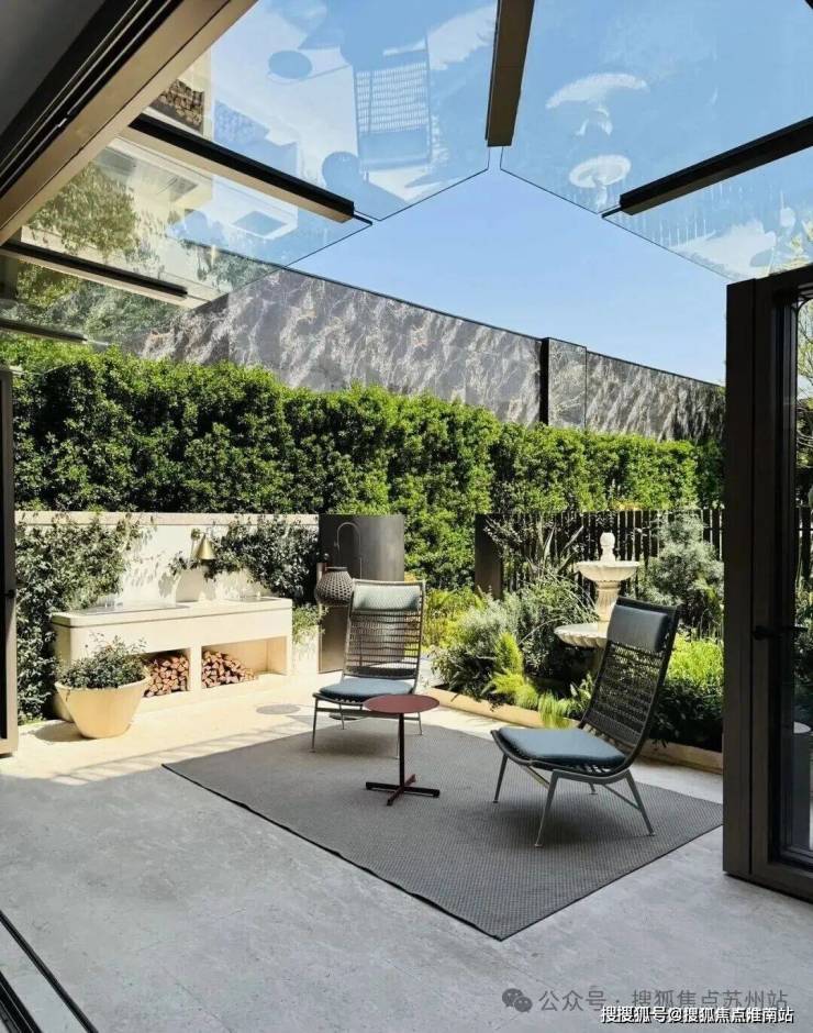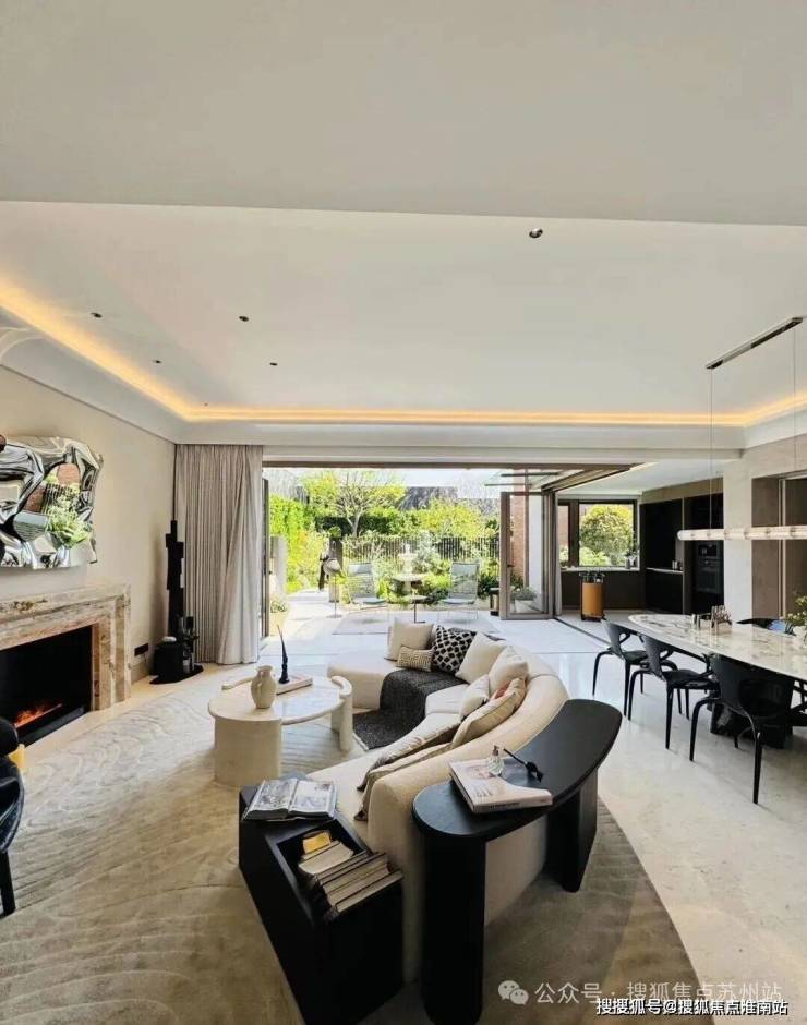 「无界空间」:客厅270度转角无柱设计,搭配落地玻璃,开阔视野将院中风景迎入日常。