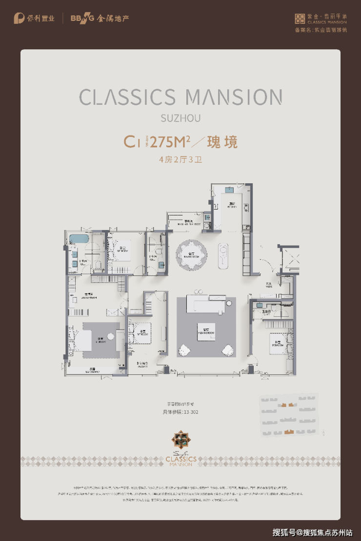 紫金·翡丽甲第有三种主力户型,分别是澄月、绮梦和瑰境,面积从190平方米到275平方米不等,均为4房2厅3卫设计。