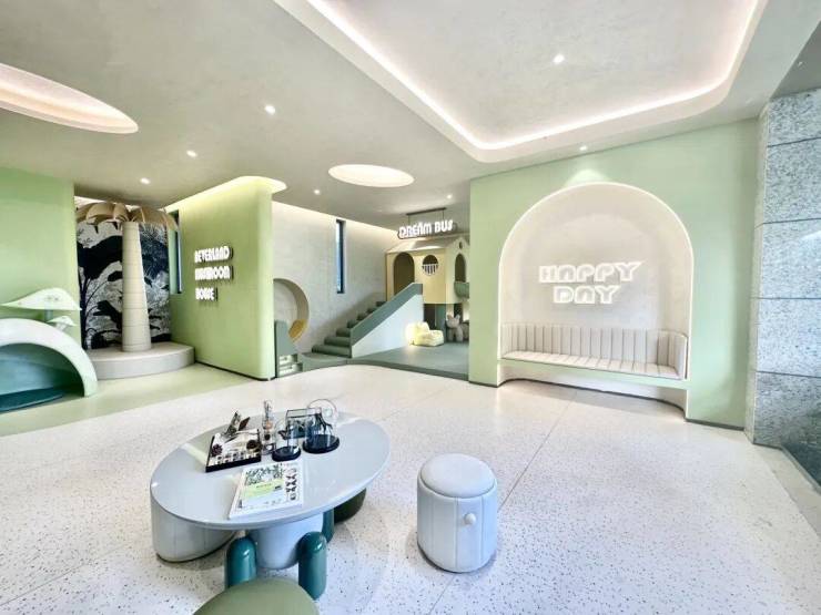 社区内部还有开放式架空层设计,结合建筑、空间、自然环境关系,室内室外联动,呈现一个景观会客、海浪书屋、儿童休闲等多重功能的开放式架空层,目前实景基本还原效果图,未来业主及孩子也有一个玩乐及阅读的开放式公共空间,更具生活趣味~