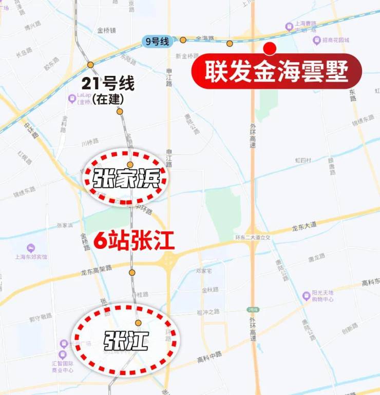 未来21号线开通后,从距离项目最近的金海路出发,4站张家浜、6站张江。