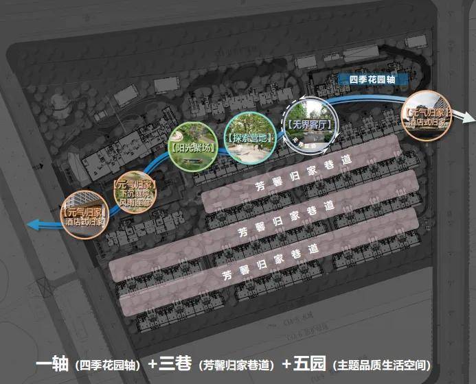 项目以「一轴-三巷-五园」为主题,打造约2.5万㎡尊享园林,营造“可漫步,可沉浸,可对话”的自然花园。