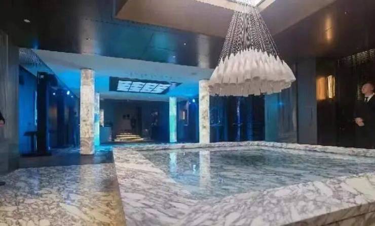 项目采用地上+地下三层同标准精装入户大堂,一楼大堂层高约6.6米,大堂选用有着媲美艺术品表现力的亚马逊绿天然奢石,结合仿古铜不锈钢、艺术壁灯为点缀,将上海的摩登气息注入归家大堂,给业主更强烈的入户仪式感。
