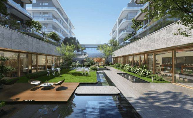 外立面采用约180°-360°环绕式露台设计,突破奇偶错层布局,避免空间交叠产生视线干扰,以更高阶的方式,垂直叠落“湖境-园境-院境”三重景观体系,衍生星光晚会、露天酒会、花园下午茶等立体墅式庭院生活场景,为生活注入全新的见解。
