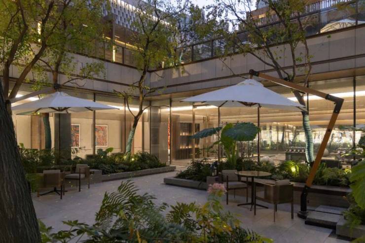 空间整体以温润的颜色为基底,底层切割石材的细腻质感与独特纹理,搭配多层次的雨林植物,营造自然、独特而富有质感的美感。幕墙和扶梯以简洁线条勾勒出结构轮廓,用现代手法捕捉东方韵味。