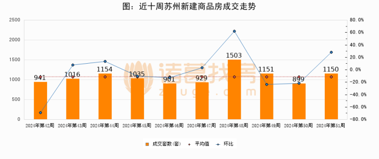 进入2024年第52周(12月23日-12月29日),苏州新建商品房成交1150套,较上周增加251套,环比上涨27.9%