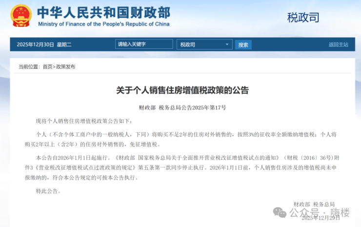 刚刚,财政部、税务总局联合发布关于个人销售住房增值税政策的公告。公告提到,个人(不含个体工商户中的一般纳税人,下同)将购买不足2年的住房对外销售的,按照3%的征收率全额缴纳增值税;个人将购买2年以上(含2年)的住房对外销售的,免征增值税。本公告自2026年1月1日起施行。