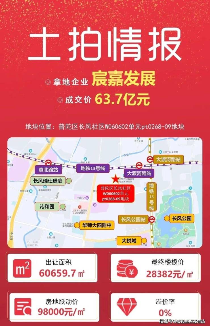 2022年,宸嘉发展以底价637000万元竞得普陀区长风社区W060602单元PT0268-09地块,容积率3.7, 房地联动价98000元/㎡。