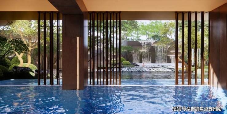 这个泳池还分室内+室外,室外部分挨着下沉庭院的水景跌瀑:
