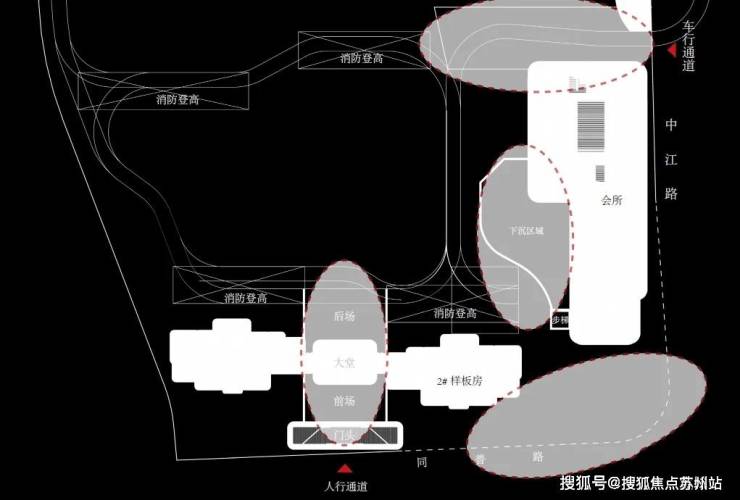 整个示范区包含了 社区大堂-样板间-下沉庭院-会所,四个功能区域,大致分布如下: