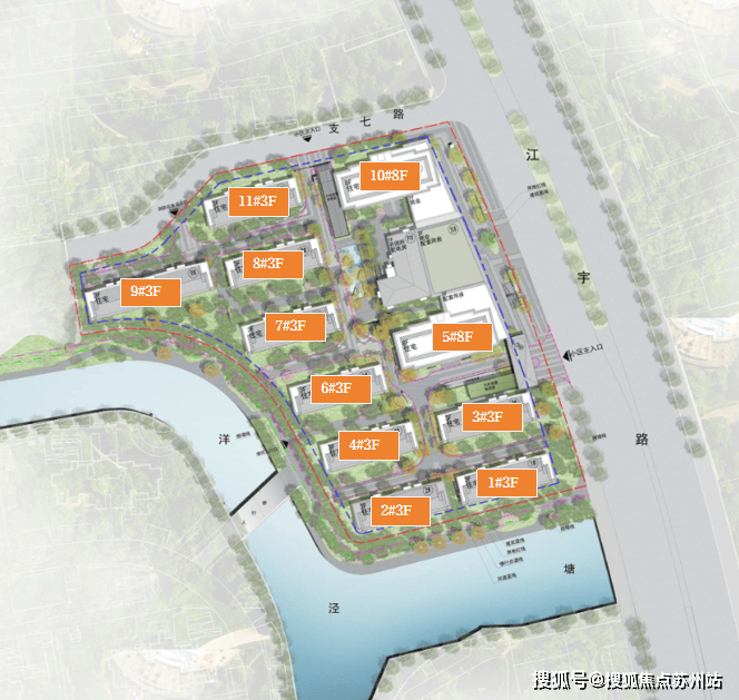 总平面图如下: 主入口位于江宇路,次入口位于支七路。