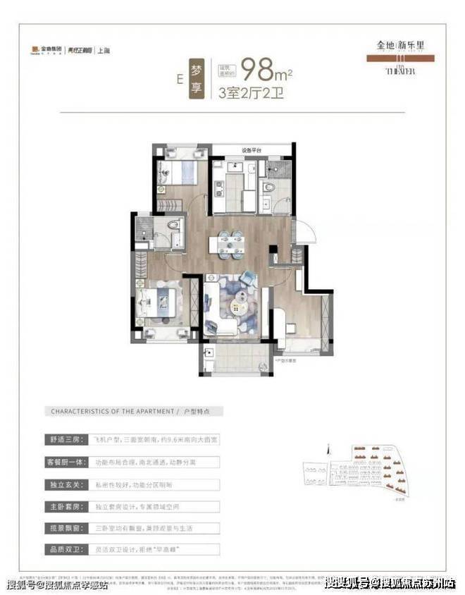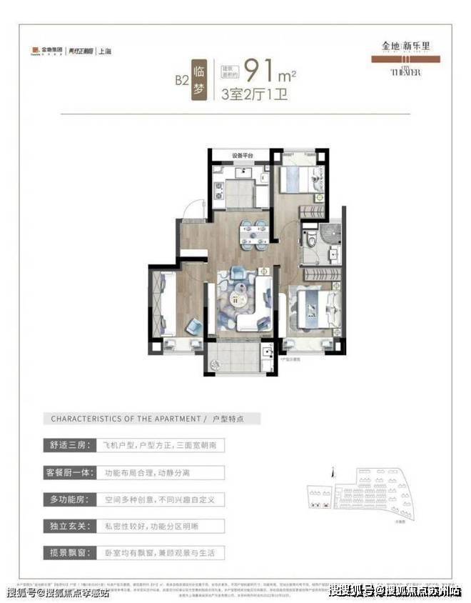 建面约91平户型设计为典型的飞机户型,这也是市面上较为热销的户型,南北通透,明厨明卫设计,三开间朝南,整体的装修采用现代简约风格,简单大方,布局清爽。金地新乐里售楼处电话:400-882-8814