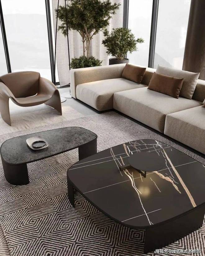 客厅中,蓝城丹枫云庐售楼处电话☎:400-882-8814(预约热线)✔✔✔设计师选用暖灰色作为空间的主色调,奠定整体沉稳的空间基调。灰白色的布艺沙发搭配上造型简洁的黑色大理石茶几,形成了色彩上的对比。大理石上细腻的纹理丰富了空间的细节,提升了整体的质感。大面的落地窗保证了室内拥有充足的光线,给人明亮的视觉感受。电视墙的设计十分简洁耐看。