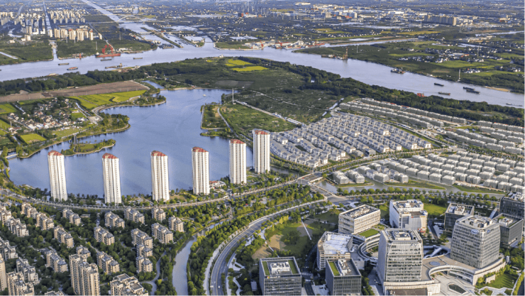 黄浦江从东、南两面环抱整个兰香湖社区,东北侧有兰香湖作为水系中心,钥匙形的外观寓意“以智慧之钥,开启生活之门”。