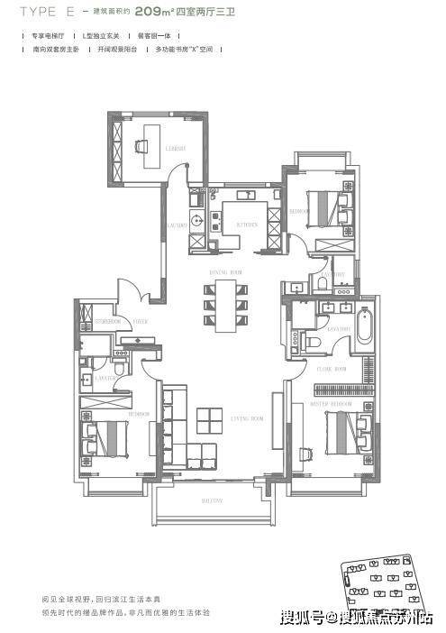 这是项目收官之作,推出的2栋楼,分别是12、16小高层,位于小区第一排,景观视野佳,俯瞰风貌别墅区。尤其是209㎡四叶草格局的王炸户型,独立电梯厅、国际一线精装、双会所、约3.5万方园林景观、无边际服务、自带约10万方合生汇商场配套,约500米一线临江。