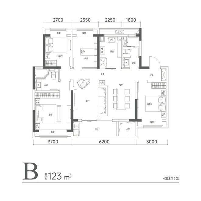 建面约123㎡做到了4房,且客厅面宽达6.2米,主房间宽达3.7米,且北面2间小房间根据需求可打通。
