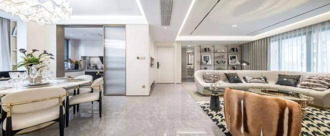 人性化细节也相当出彩。比如,客厅和主卧都标配悬浮吊顶、无主灯设计,背景墙采用皮革和铝合金拼接,也都是实体交付的。