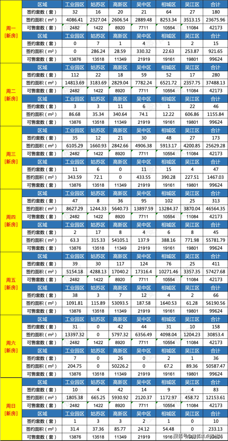 新房住宅共网签1598套;工业园区306套;姑苏区92套;高新区296套;吴中区387套;相城区382套;吴江区135套;