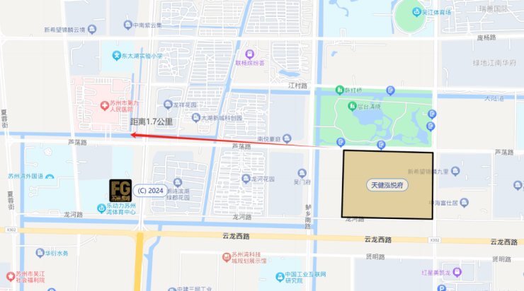 距离苏州市第九人民医院(三乙综合医院)1.7公里,最近的三甲医院可能是吴中太湖新城的市立医院总院。
