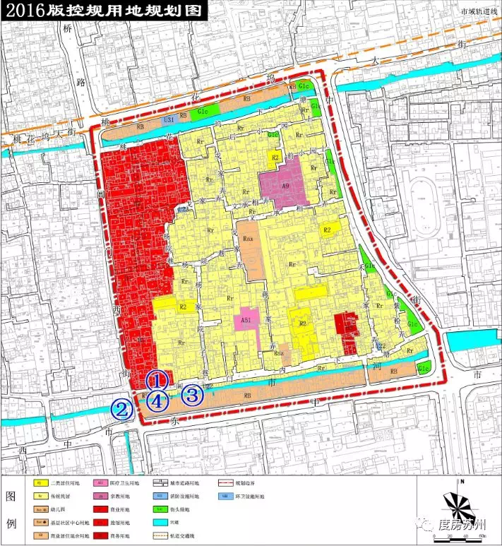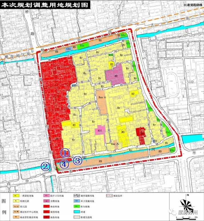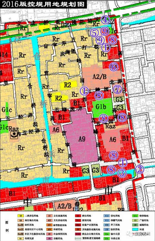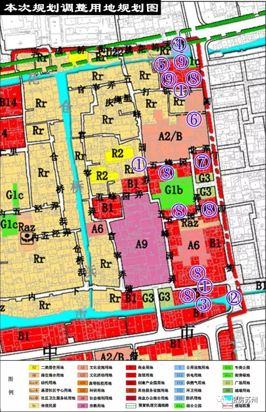4、位于阊门西街与阊门内下塘交叉口东北角的地块现已平整,原规划为居住商业混合用地(RB)、传统居民用地(Rr),本次规划将其调整为商业用地(B1)。同时,地块边界线结合阊门内下塘现状道路线型、中市河现状河道线型进行相应调整。