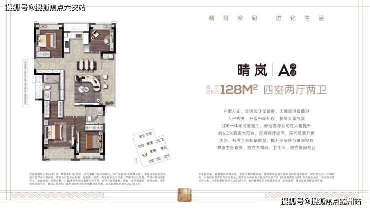 - **建面约128㎡四房两卫**:双阳台设计(6.4米景观阳台+生活阳台),四开间朝南,主卧套房配置衣帽间,满足三代同堂需求。