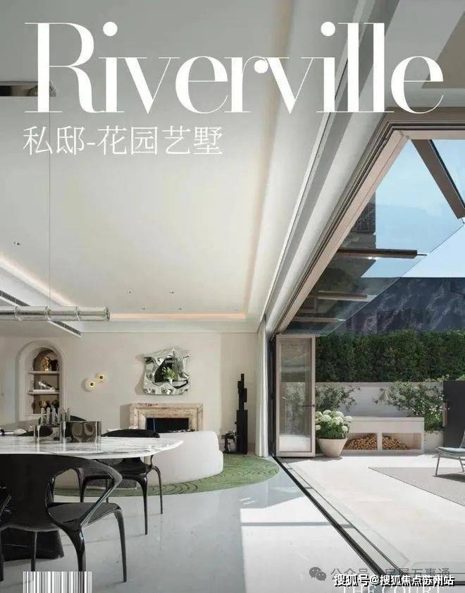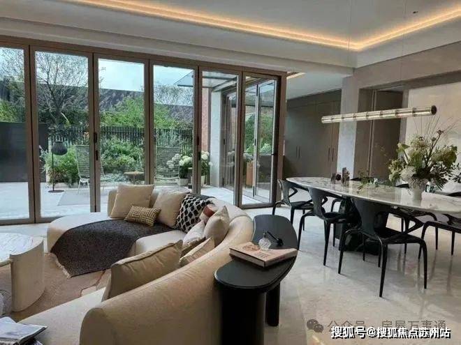 「无界空间」:客厅270度转角无柱设计,搭配落地玻璃,开阔视野将院中风景迎入日常。